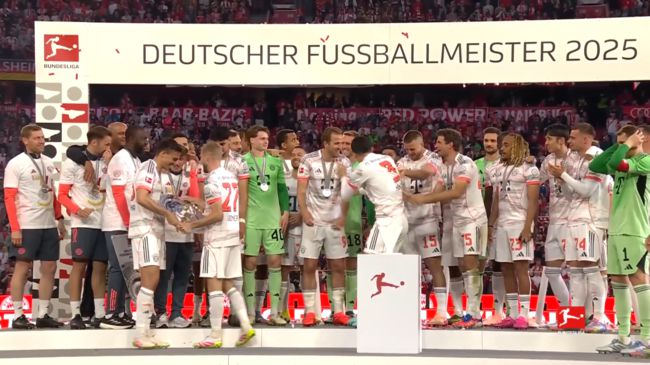 바이에른은 지난 11일(한국시간) 독일 뮌헨의 알리안츠 아레나에서 열린 2024-2025시즌 분데스리가 33라운드 보루시아 묀헨글라트바흐전에서 2-0으로 승리한 뒤 우승 세리머니를 펼쳤다.