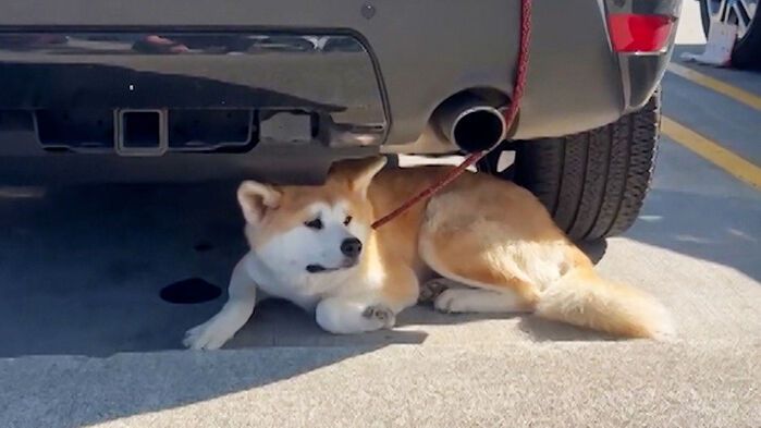 반려견 한 마리가 줄에 묶인 채 차 밑에 들어가 있습니다.