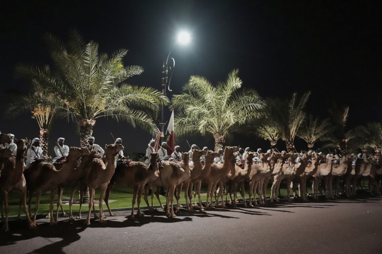 카타르 경호원들이 14일(현지시간) 도하 루사일 궁전에서 열린 도널드 트럼프 미국 대통령과 셰이크 타밈 빈 하마드 알 타니 카타르 국왕의 국빈만찬장 밖에서 낙타를 탄 채 호위하고 있다. AP연합뉴스 |