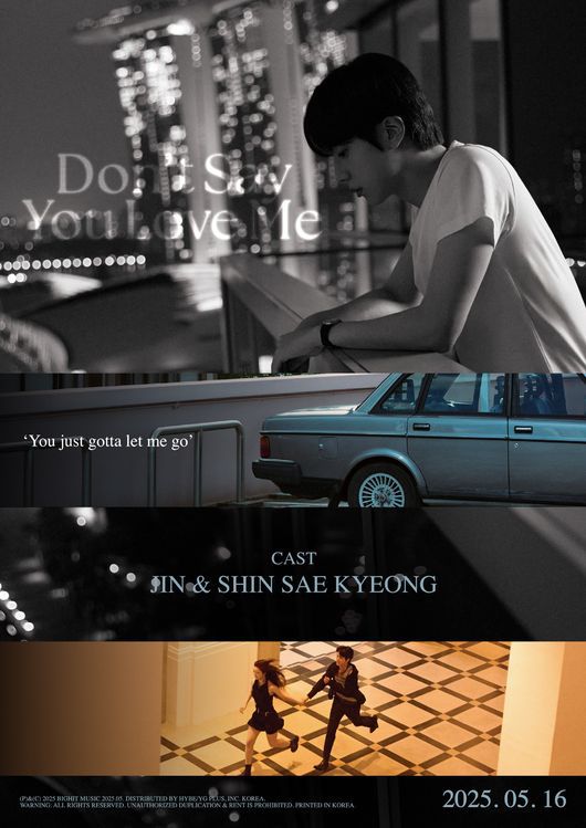 드라마타이즈 형식으로 제작된 ‘Don’t Say You Love Me’ 뮤직비디오는 진과 더불어 배우 신세경이 출연한다. 오늘(15일) 추가 공개된 뮤직비디오 포스터 속 연인으로 분한 두 사람의 다채로운 장면들이 아련하고 아름답다. 앞선 티저 영상은 이들이 마주하는 단 한 장면만으로 진한 여운을 남긴 바 있다.