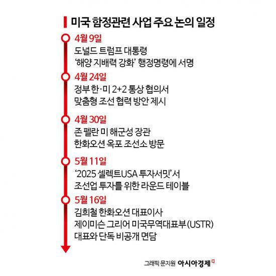 이날 비공개 면담에서는 지난달 한미 2+2 통상 협의에서 정부가 제시한 맞춤형 조선 협력 방안보다 구체적인 논의가 있을 것으로 보인다. 한화오션은 필리조선소 투자 외 추가 투자 방안, 해양 인력 육성 협력 방안, 신규 선박 건조 일정 등을 제안할 것으로 예상된다. 이 제안이 미국의 선박건조 일정과 맞아떨어진다면 대규모 선박 건조에 대한 패키지 요청도 가능하다.