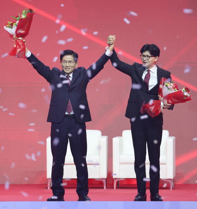 ▲국민의힘 대선 후보로 선출된 김문수 후보가 3일 경기 고양시 킨텍스에서 열린 국민의힘 전당대회에서 꽃다발을 받은 뒤 한동훈 후보와 함께 인사하고 있다. ⓒ연합뉴스 |
