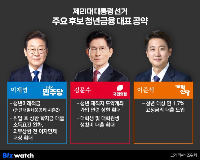 제21대 대선 후보들이 10대 공약 중 하나로 '청년금융지원'을 내세웠다. 청년 가입 한정 적금을 출시하고 청년에 한해 대출 요건을 완화하겠다는 게 골자다.