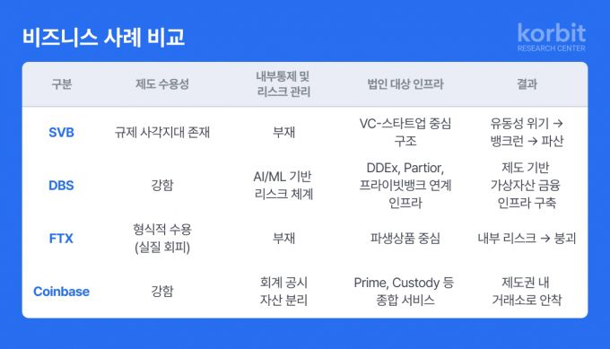 보고서에 따르면 SVB와 FTX는 기술 중심 전략과 빠른 성장으로 시장을 장악했으나 내부통제 미비, 자산 분리 실패, 규제 회피 등 구조적 결함으로 인해 결국 붕괴했다. 반면, DBS와 코인베이스는 회계 투명성, 자산 수탁 체계, 규제 준수 등 제도권 기준을 충실히 이행하며 법인 고객의 신뢰를 확보하고 지속 가능한 성장 기반을 마련했다.