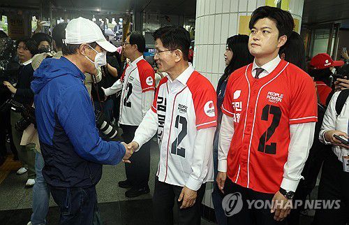 (서울=연합뉴스) 김도훈 기자 = 국민의힘 김문수 대선 후보가 15일 서울 구로구 신도림역을 찾아 시민들에게 지지를 호소하며 인사하고 있다. 오른쪽은 김용태 비대위원장. 2025.5.15 [공동취재]