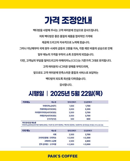 15일 더본코리아는 “국제 원두값 상승과 고환율 상황에도 불구하고 본사가 인상분을 일정 부분 감내하며 노력해왔다. 그럼에도 불구하고 계속된 원가 부담으로 일부 메뉴 가격을 소폭 조정한다”고 밝혔다. 더본코리아는 이번 인상은 빽다방 점주와의 논의를 통해서 결정했으며, 가장 판매량이 높은 ‘아이스 아메리카노’ 가격은 인상하지 않기로 결정했다고 밝혔다.