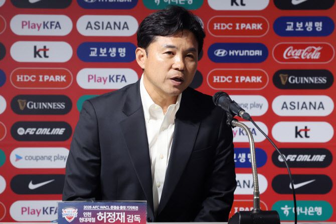 여자축구 인천 현대제철 허정재 감독이 15일 서울 종로구 축구회관에서 열린 2025 아시아축구연맹(AFC) 여자 챔피언스리그(ACL) 준결승 출정 기자회견에서 출사표를 던지고 있다. 사진=연합뉴스