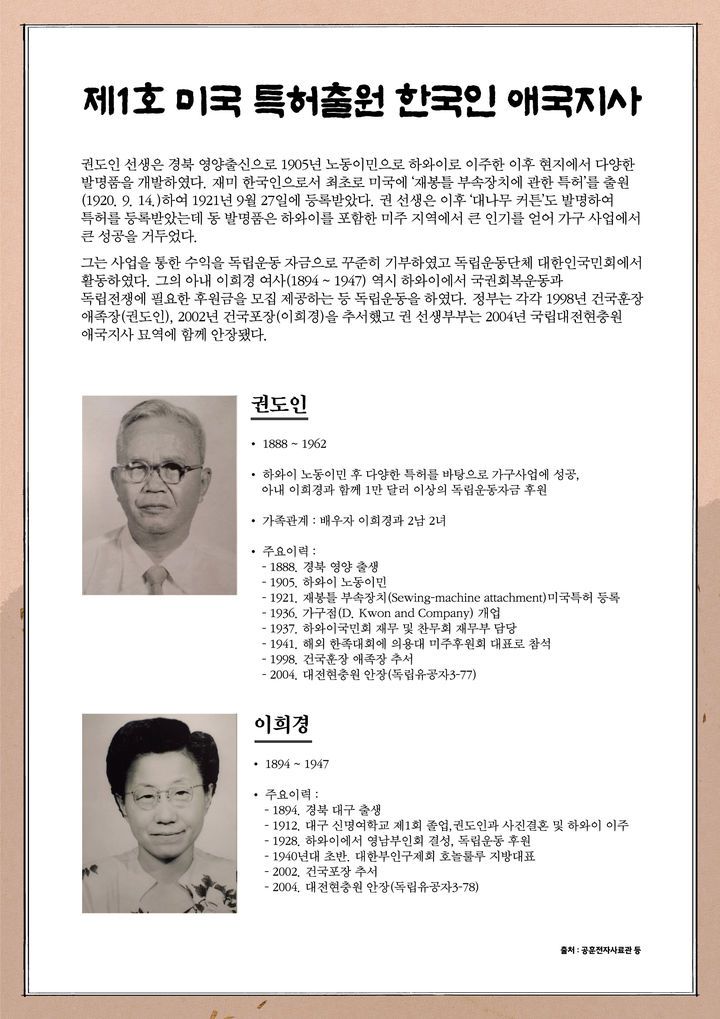 특허청에 따르면 경북 영양 출신의 권도인 선생은 1905년 노동이민으로 하와이로 이주한 후 재미 한국인으로는 처음 미국에 '재봉틀 부속장치에 관한 특허'를 출원(1920년 9월 14일)해 이듬해인 1921년 9월 27일에 등록받았다.