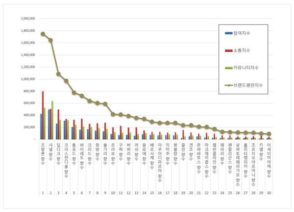 향수 브랜드평판 1위를 기록한 조말론 향수 브랜드는 참여지수 427,322 소통지수 796,493 커뮤니티지수 526,142가 되면서 브랜드평판지수 1,749,957로 분석됐다. 지난 4월 브랜드평판지수 1,480,081과 비교해보면 18.23% 상승했다.