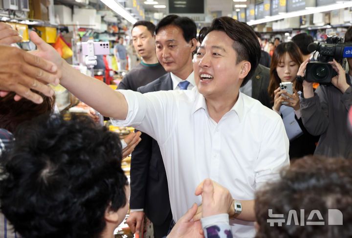 [부산=뉴시스] 하경민 기자 = 이준석 개혁신당 대통령 선거 후보가 14일 부산 중구 자갈치시장에서 상인들과 인사하며 지지를 호소하고 있다. 2025.05.14. yulnetphoto@newsis.com |