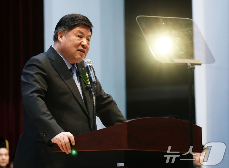 서정진 셀트리온 회장이 21일 서울 광진구 건국대학교에서 열린 2025년도 전기 학위수여식에서 축사를 하고 있다. 2025.2.21/뉴스1 ⓒ News1 오대일 기자 |