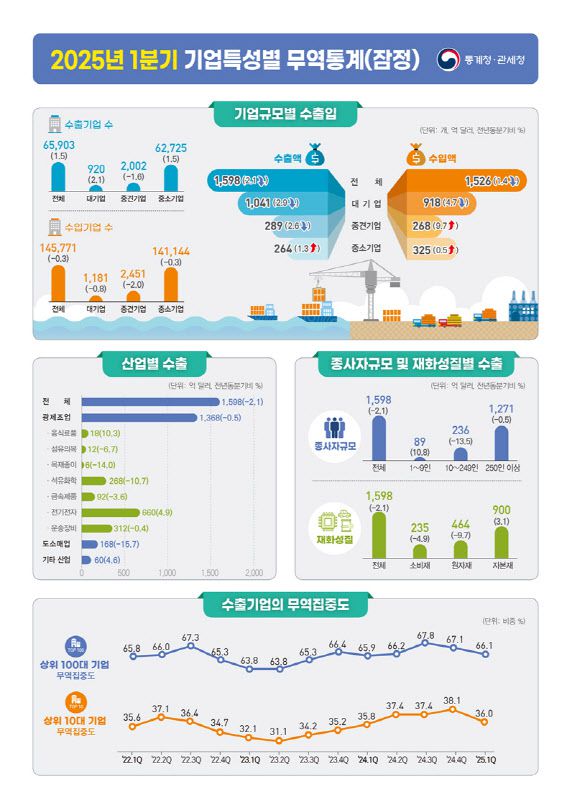 15일 통계청의 ‘2025년 1분기 기업 특성별 무역통계’에 따르면, 지난 1분기 전체 수출액은 전년 동기 대비 2.1% 감소한 1598억 달러였다. 이중 대기업 수출액은 2.9%, 중견기업 수출액은 2.6% 각각 줄어든 가운데 중소기업의 수출액이 1.3% 늘어났다.