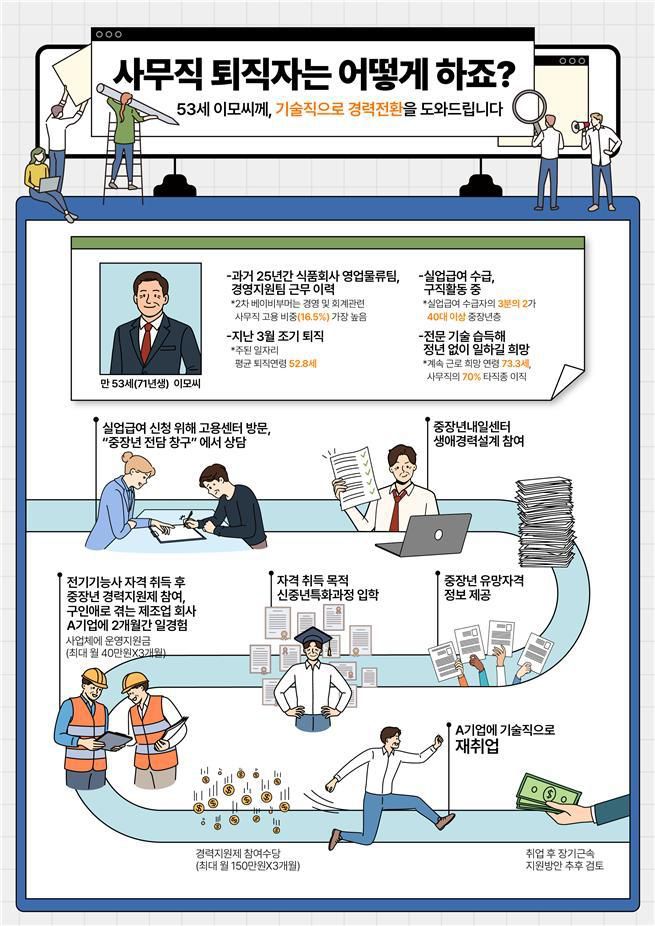 2021년 고령화고용패널조사에 따르면 조기 퇴직한 50대 사무직·판매직·서비스직 등의 약 70%가 타 직종으로 재취업했다. 이들 이직자는 생소한 업무를 처음 맡아야 하는 만큼 일경험이 중요하다는 판단에서다. 참여한 50대 지원자 대상으로 월 최대 150만원, 참여기업에 40만원을 최대 3개월 지원한다.