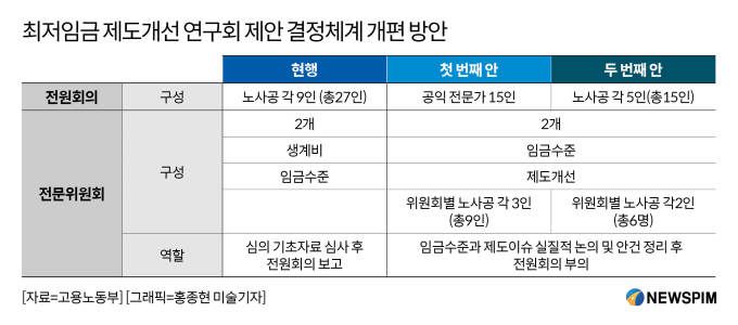 첫 번째 개선안은 최저임금위원회 위원 모두 전문가로 임명하는 방식이다. 현재는 노사정이 각 9명씩 선정한다. 15인으로 줄일 경우 노사정 추천 위원으로 3배수 풀을 구성하고 이들 가운데 노사정 논의를 거쳐 15명을 최종 선정한다.