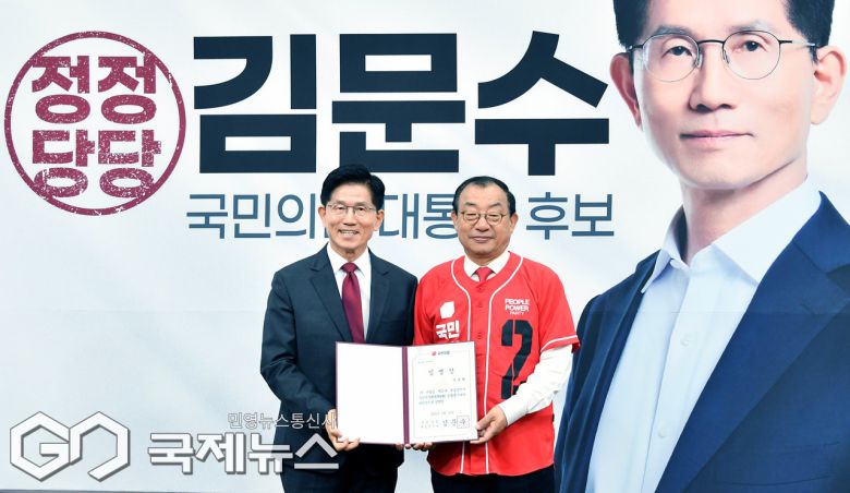 (서울=국제뉴스) 김문수(왼쪽) 국민의힘 대선후보가 15일 오전 서울 여의도 국회에서 열린 중앙선대위 회의 및 중앙선대위 임명장 수여식에서 이정현 전 새누리당 대표에게 공동선대위원장 임명장을 수여한 뒤 기념촬영하고 있다./사진=이용우 기자