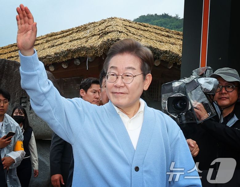 이재명 더불어민주당 대통령 후보가 15일 오전 유튜브 K-이니셔TV 케미폭발 '동서화합' 화개장터 라이브를 하기 위해 경남 하동군 화개장터 입구에 도착, 인사하고 있다. 2025.5.15/뉴스1 ⓒ News1 안은나 기자 |