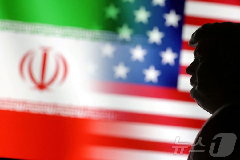 도널드 트럼프 미국 대통령의 뒤로 미국과 이란 국기가 나란히 펼쳐진 모습. 2025.01.15 ⓒ 로이터=뉴스1 |