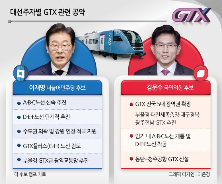 15일 헤럴드경제가 양당 대선 경선 후보들의 공약을 분석한 결과, 양당 후보 모두 GTX A~C 노선의 신속 추진과 광역교통망 확장을 내걸었다. 두 후보 모두 철도를 통해 수도권의 통근 과밀화(GTX)를 해소하고 지역 간 연결성을 높이는 국토균형발전(광역교통망)을 이루겠다는 것엔 이견이 없다. 이준석 개혁신당 대선후보는 별도의 교통 공약을 밝히지 않았다.
