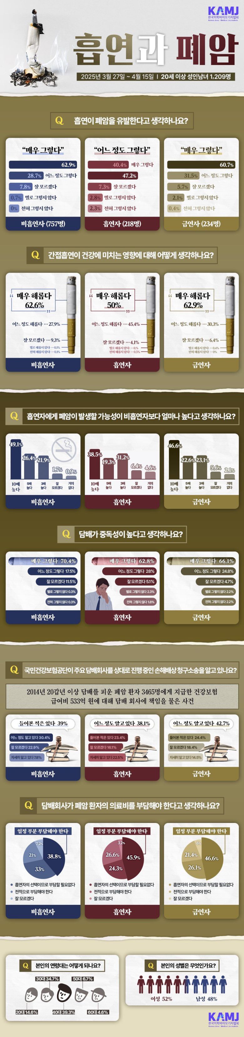 대한 결핵 및 호흡기 학회와 한국의학바이오기자협회가 15일 개최한 ‘흡연과 폐암, 주목받는 담배 소송’ 심포지엄에서 이런 내용의 설문조사 결과가 공개됐다. 설문은 올 3~4월 20세 이상 성인 1209명을 대상으로 진행됐다. 응답자는 비흡연자 757명, 흡연자 218명, 금연자 234명이다.