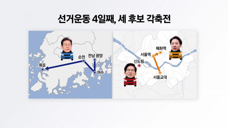 그래서 영남에 거쳐서 전통적인 지지기반인 호남으로 갔다, 이렇게 보시면 되고. 역시 김문수 후보 입장에서도 특히 부산경남은 수성을 해야 되는 지역이에요. 그러니까 대구경북은 본인이 영천 출신이지 않습니까? 고향이기도 하고 대구경북을 거쳐서 PK 민심을 수성하겠다는 강한 의지를 드러낸 것이고. 이준석 후보 같은 경우에도 원적지가 원래 경북 칠곡입니다. 이준석 후보 같은 경우 젊은 층과 중도층을 겨냥하고 있기 때문에 자기가 연고가 있는 지역 아니면 수도권 이 부분에 집중이 돼 있어요. 그래서 오늘 김문수 후보는 오전 일정을 중앙당 선대위 일정으로 대부분 봤고요. 이준석 후보는 우리가 잘 아는 것처럼 학식, 젊은 층 만나서 밥 먹는 것으로 시작을 했는데 각각의 노림수가 일정에서 다 드러난다고 봅니다.