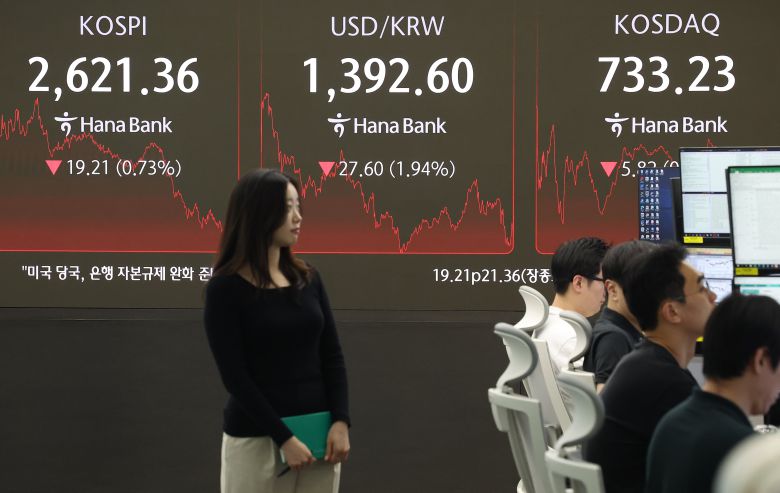15일 서울 중구 하나은행 본점 딜링룸 현황판에 코스피, 원·달러 환율, 코스닥 지수가 표시돼 있다. /연합뉴스