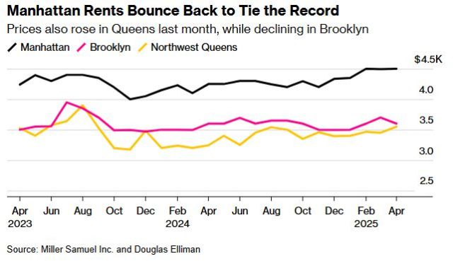 뉴욕 맨해튼 아파트 시장 임대료가 사상 최고치를 이어가고 있다. 여름을 앞두고 임차 수요가 높아진 가운데 신규 공급이 없어 가격은 당분간 더 오를 전망이다.