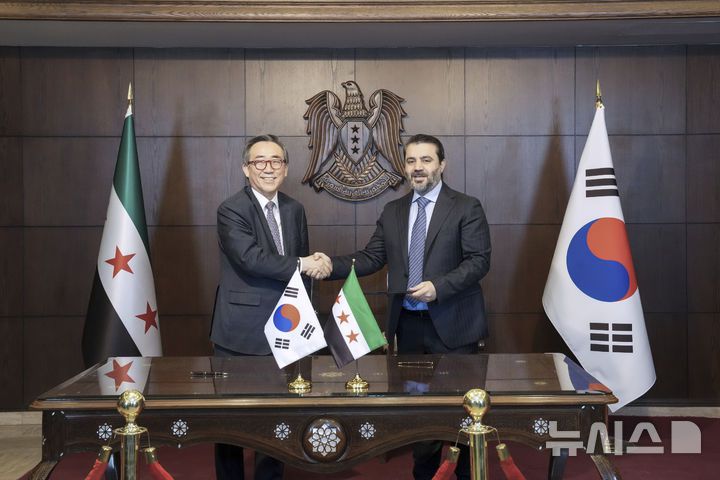 [다마스쿠스=AP/뉴시스] 조태열(왼쪽) 외교부 장관이 10일(현지 시간) 시리아 다마스쿠스에서 아스아드 알-샤이바니 시리아 외교장관과 ‘양국 간 외교관계 수립에 관한 공동성명’에 서명한 후 악수하고 있다. 2025.04.11. |