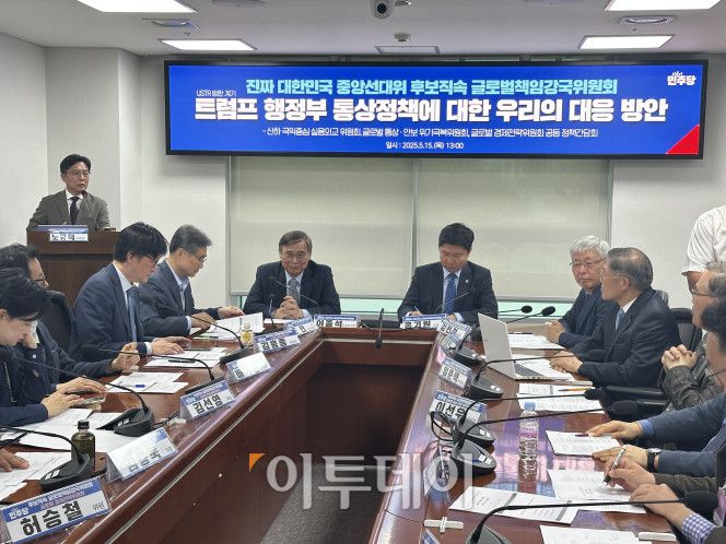 15일 서울 여의도 국회에서 열린 ‘더불어민주당 중앙선거대책위원회 후보 직속 글로벌책임강국위원회 산하 위원회’ 정책간담회에서 참석자들이 트럼프 행정부 통상정책에 대한 우리의 대응 방안에 대해 논의하고 있다. 2025.05.15. |