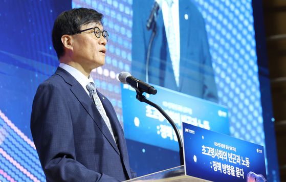 이창용 한국은행 총재가 15일 오후 세종시 반곡동 한국개발연구원(KDI)에서 열린 '초고령사회의 빈곤과 노동:정책 방향을 묻다' 주제로 열린 KDI-한국은행 공동 심포지엄에 참석, 환영사를 하고 있다. 뉴스1 |