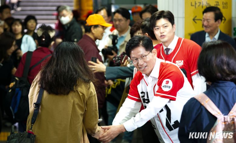 김문수 국민의힘 대선 후보가 15일 서울 구로구 신도림역에서 출근하는 시민들에게 인사하고 있다. 유희태 기자