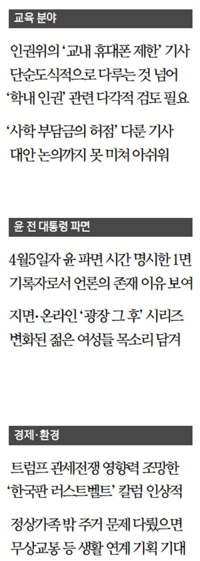 ■김용=도널드 트럼프 미국 대통령에 저항하는 미국 대학과 관련된 기사가 여러 꼭지 있었다. 하버드대 등 아이비리그 소속 대학들이 어떻게 연대해서 트럼프에 맞서는가를 상세하게 보도했다. 한국 대학도 돌아보면, 가깝게는 김건희 학위논문 표절 문제가 있었다. 누가 봐도 단순하고 명확한 사안인데 권력 앞에서 대학이 굉장히 쪼그라든 모습을 보였다. 트럼프와 미국 대학 기사를 보면서 한국 대학과 국가권력의 관계가 대비되어 떠올랐다. 경향신문이 이를 좀 더 추적해보면 어떨까. 독일도 극우정당이 3당이 돼 반(反)다문화 교육 등 독일 교육에 대해 이런저런 요구를 하고 있다. 트럼프 시대 미국 대학들이 직면한 문제가 장차 세계화된 문제가 될 가능성이 있다. <“교원 지도, 학생 인권에 기여”…인권위의 교내 휴대폰 제한 논리>(4월30일자) 기사는 단순도식적인 기사다. ‘학교에서 휴대전화를 가지고 있는 건 인권의 문제인데 규제하는 건 침해다’라는 게 골자다. 요즘 인권위원회가 하도 이상한 일을 많이 하니까 그 일환으로 반인권적인 결정을 했다는 기조의 기사다. 그런데 교육공간 인권 문제에 대해 조금 다각적인 검토가 필요하다. 요즘 학내에서는 기분 나쁘게 하면 다 인권침해라고 할 정도다. 결과적으로는 교사들이 교육적인 조치를 거의 못하게 돼 있는 상황이다. 학교 내에서 휴대전화로 발생하는 문제가 많다. 초중등 학교교육 안에서 인권 개념은 좀 더 심화된 논의가 있어야 할 것 같다. <청소년 가장 선호하는 매체는 ‘쇼트폼’…절반이 “AI 쓴다”>(4월2일자)와 임문영 미래전환 대표의 <뉴미디어 문해력 키워야 한다>(4월30일자)를 주목했다. 요즘 청소년들의 미디어를 통한 정치 사회화가 굉장히 활성화됐다. 그런데 학교는 교육은 정치적 중립이라 해서 입도 뻥끗하면 안 된다. 쇼트폼이 아이들을 어떤 방식으로 사회화시키는가. 이것에 대한 추적기 등을 통해 심화된 논의가 필요하다. <위기 청소년 33% “일상 힘들 정도 우울 경험”>(4월30일자) 기사가 나올 무렵 청주시 고등학생이 교사를 폭행한 사건이 있었다. 약간 정신적 어려움이 있는 학생이었던 것 같은데 이 부분을 추가해보면 좋을 것 같다. 학원이 많은 지역의 경우 자해하는 아이가 많아졌다. 소아청소년과 가기도 어려워 예약하려면 6개월 이상 걸린다는 말도 있다. 아이들이 병들어가는 실태를 좀 조사했으면 좋겠다.