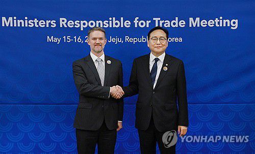 제이미슨 그리어 USTR 대표와 기념촬영하는 정인교 통상교섭본부장(서울=연합뉴스) 정인교 산업통상자원부 통상교섭본부장(오른쪽)이 15일 제주 서귀포시 제주국제컨벤션센터에서 열린 '2025 APEC 통상장관회의'에 참석한 제이미슨 그리어 미국 무역대표부(USTR) 대표와 기념 촬영을 하고 있다. 2025.5.15 [산업통상자원부 제공. 재판매 및 DB 금지] photo@yna.co.kr