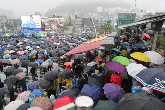 이재명 더불어민주당 대통령 후보가 15일 오후 전남 여수시 이순신광장을 찾아 유세를 벌이자 우산을 쓴 시민들이 광장을 가득 메우고 있다. 공동취재사진