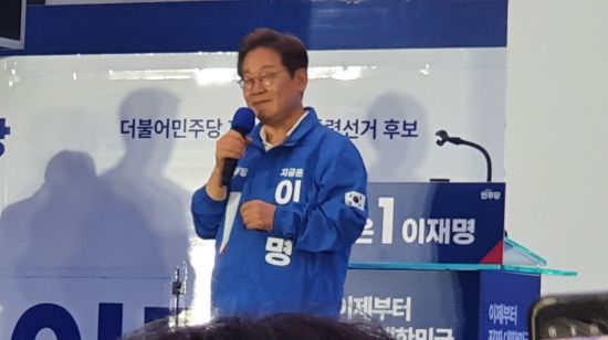 이재명 더불어민주당 대선 후보가 15일 오후 7시께 목포 평화광장 원형상가에 마련된 유세장에서 목포 시민들에게 적극적인 지지를 호소했다. 심진석 기자 |