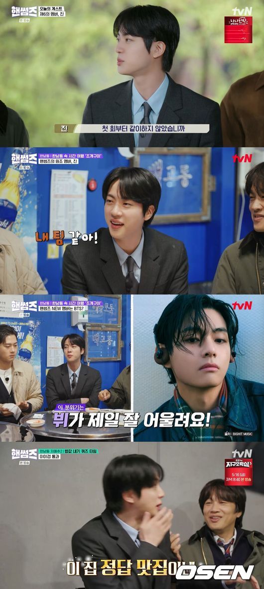 15일 방송된 tvN ‘핸썸가이즈’에는 차태현, 김동현, 이이경, 신승호, 오상욱과 함께 일일 게스트 방탄소년단 진이 출연해 서울 한남동 지역의 점메추(점심 메뉴 추천) & 저메추(저녁 메뉴 추천) 원정에 나선다.