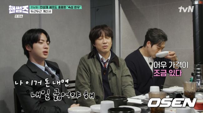 긴장감 속에 진행된 밥값내기 퀴즈 타임. "한국을 대표하는 김치, 오징어, 그리고 ‘이것’?"이라는 문제에 진은 "BTS 굿즈인가 보다. 앨범인 거 같다"라며 예상을 했고, 실제로 정답은 '앨범'이었다. 이후 진행된 개인전 퀴즈에서도 "태종 때 ‘우금령’ 기간에 소를 먹은 사람을 신고할 경우 포상을 내렸다고 한다"라는 문제를 듣고 진은 “신고한 사람한테 재산을 줬나 보다”라고 한 가운데, 실제로 정답을 맞혀 놀라움을 자아냈다.