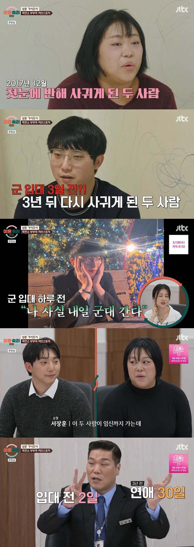 아내는 "사귀자고 한 건 군대 가기 3일 전이었고, 군 입대 하루 전에 '군대 간다'고 해서 뒤통수 맞은 느낌"이라며 회상했다. 남편은 첫 휴가 일주일 내내 아내 집에 머물렀고, 부대에 복귀한 지 2일 만에 아내가 임신했다는 소식을 들었다고 밝혔다.