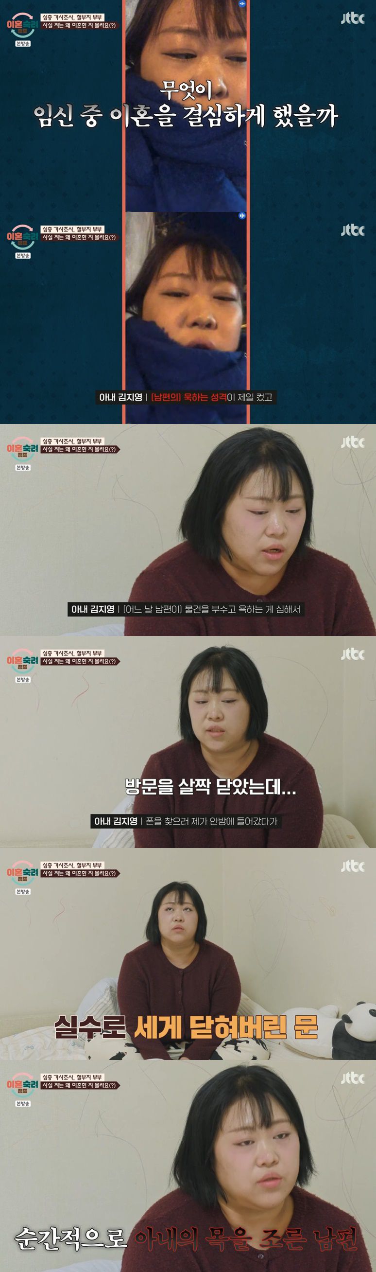이혼 사유에 대해서 아내는 "(남편의) 욱하는 성격이 제일 컸다. 물건을 부수거나 화를 내면서 욕하는 게 많았다"며 "남편이 유리창을 깨서 손에 피가 엄청 났다. 구급차가 와서 손을 꿰맸다"며 남편의 문제점을 극심한 욕설과 폭력성을 꼽았다.