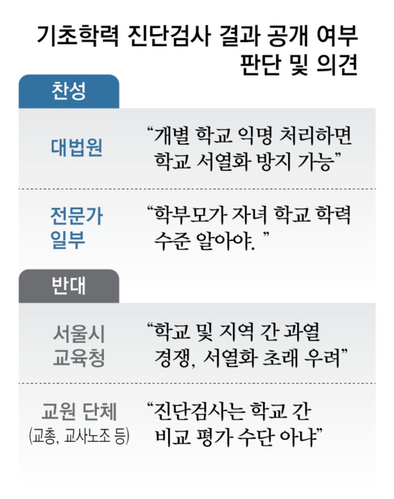 기초학력 진단검사는 초1∼고1생을 대상으로 학기 초에 시행하는 시험이다. 검사 결과는 학교만 알고 학생과 학부모에겐 공개하지 않는다. 이에 서울시의회가 코로나 장기화로 학력 저하 우려가 커지던 2023년 5월 학교별 검사 결과를 공개하고 기초학력 미달 학생을 최소화할 수 있도록 교육감의 지원 의무를 규정한 조례를 만들자 교육감이 과열 경쟁과 학교 간 서열화를 조장한다며 소송을 낸 것이다. 대법원은 이 조례에 대해 ‘학교 교육에 대한 서울시민의 알권리를 보장하고 참여도를 끌어올려 기초학력을 신장시킬 수 있다’고 판시했다.