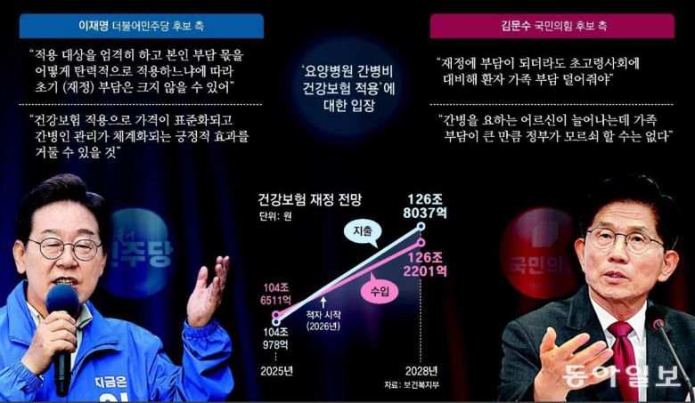 이재명 더불어민주당 대선 후보와 김문수 국민의힘 대선 후보가 나란히 요양병원 간병비를 건강보험으로 지원하는 ‘간병비 급여화’ 공약을 내놨다. 노인의료복지시설인 요양원과 달리 의료기관인 요양병원을 이용할 경우 간병비를 전액 본인이 부담해야 한다. ‘간병지옥’ ‘간병파산’이라는 말이 나올 정도로 국민들의 걱정과 부담이 큰 것은 사실이다. 하지만 내년부터 적자로 돌아서는 건강보험을 끌어들여 문제를 해결하는 것이 맞는지는 신중히 따져봐야 한다.