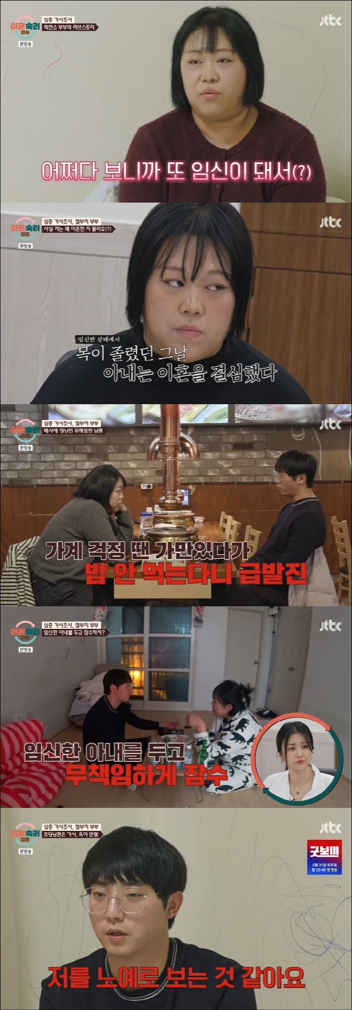 둘째 임신 중 이혼을 결심한 이유에 대해 아내는 "욱하는 성격이 제일 컸고 물건을 부수거나 화를 내면서 욕하는 게 되게 많았다. 유리창을 깨서 손에 피가 철철 나서 응급실에 간 적도 있었다"고 밝혔다. 다투다 문을 세게 닫았다는 이유로 남편은 임신 중인 아내의 목을 조르기까지 했다. 그러나 남편은 이혼 사유를 모른다며 "그냥 (아내에게) 무슨 일 있구나 싶었다"고 태연하게 말했다.