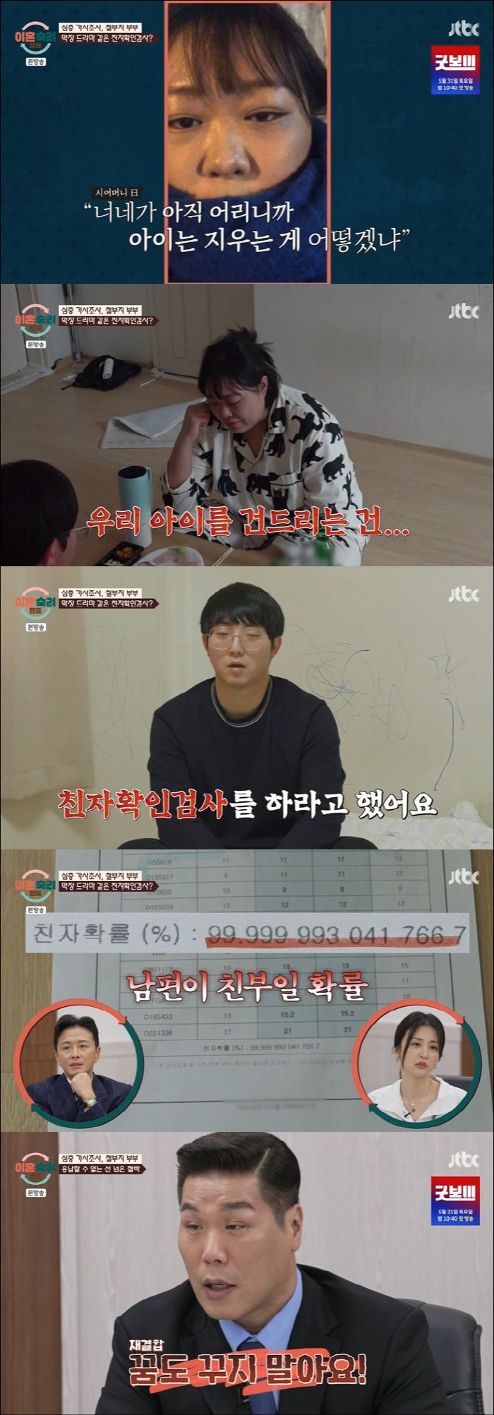 하지만 아내가 재결합을 고민하는 결정적 이유는 따로 있었다. 부부가 이혼한 이유는 시댁 때문이었다. 아내는 "임신하고 나서 시어머니랑 처음 연락이 닿았다. 시어머니께서 너희가 아직 어리니까 아이는 지우는 게 어떻겠냐 하더라"라고 밝혔다. 심지어 아이가 태어난 후 시어머니는 친자확인검사까지 요구했다. 아내는 남편에게 "너도 나를 못 믿겠다고 하지 않았냐"고 상처를 고백했다.