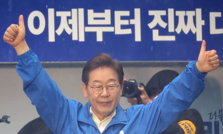 이재명 더불어민주당 대선후보가 15일 전남 순천시 연향동 패션의 거리에서 열리 선거 유세에서 시민들에게 인사하고 있다. /남강호기자 |