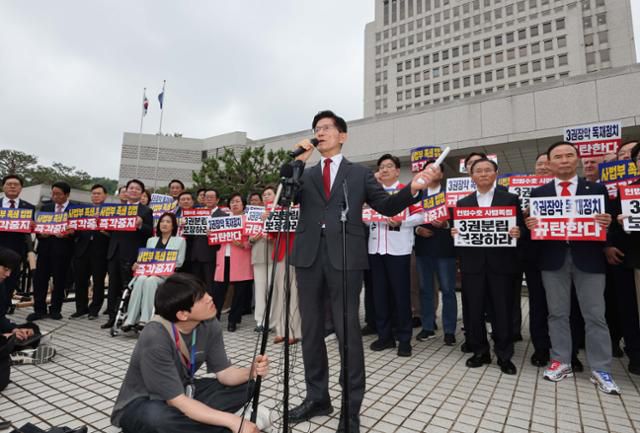 김문수 국민의힘 대선 후보가 15일 서울 서초구 대법원 앞에서 열린 사법부 수호 및 민주당 규탄대회에서 발언하고 있다. 하상윤 기자 |