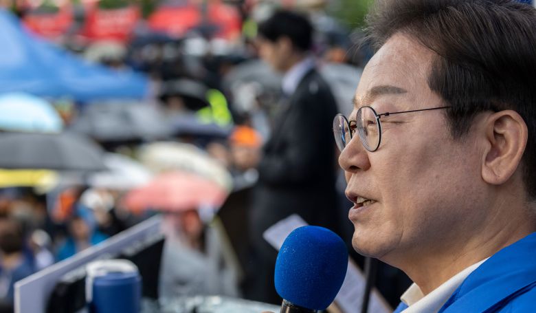이재명 더불어민주당 대통령 후보가 15일 전남 광양시 전남드래곤즈구장 북문에서 유세를 하고 있다. /뉴스1 |