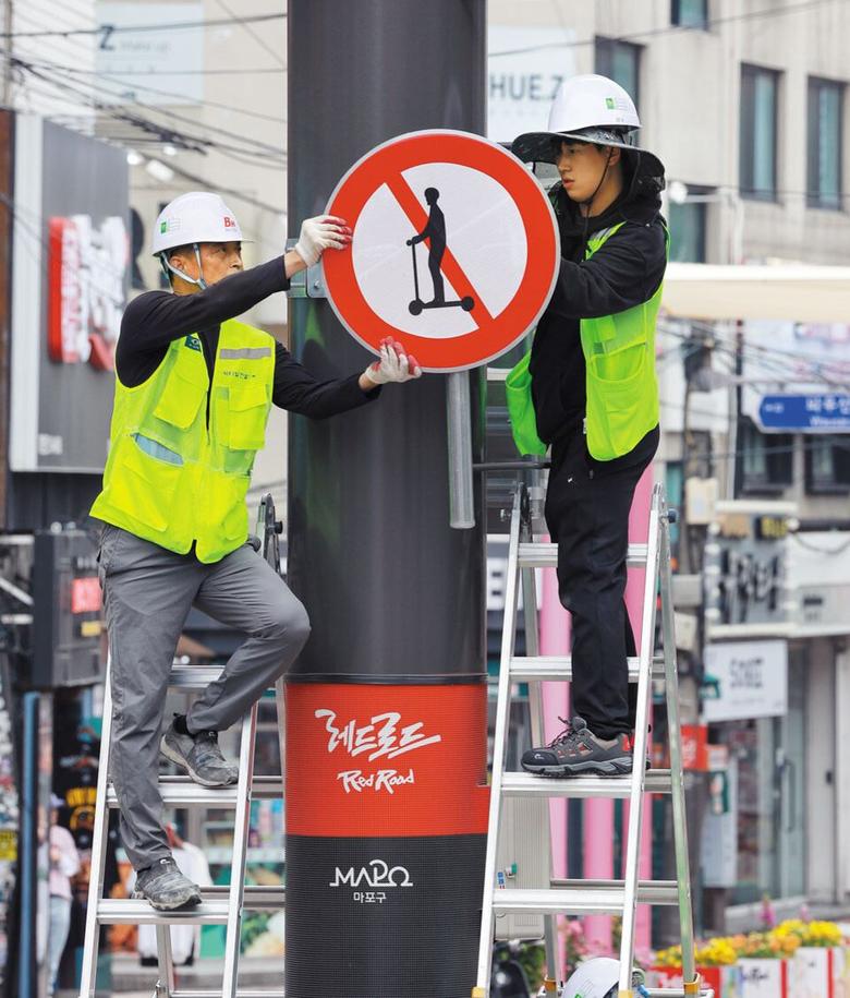 15일 서울 마포구 홍대 레드로드에 ‘킥보드 통행 금지’ 표지판을 설치하는 모습. 서울시는 16일부터 홍대 레드로드와 서울 서초구 반포동 학원가에서 ‘킥보드 없는 거리’를 운영한다. 낮 12시부터 오후 11시까지 킥보드 통행이 금지된다. 여기서 킥보드를 타다가 적발되면 범칙금 3만원(어린이보호구역은 6만원)을 내야 한다. 다만 전국 최초로 시행하는 제도라 5개월간 계도 기간을 두기로 했다.