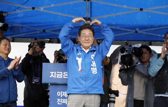이재명 더불어민주당 대선후보가 15일 전남 여수시 이순신 광장 유세에서 지지자들에게 인사하고 있다. 김성룡 기자