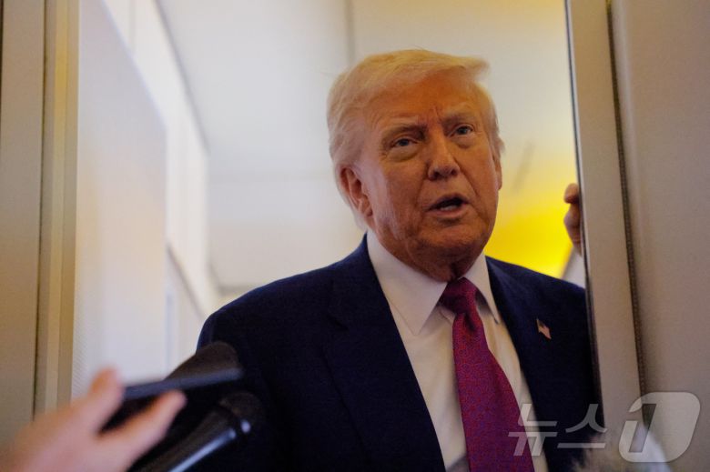 도널드 트럼프 미국 대통령이 15일(현지시간) 아랍에미리트(UAE) 아부다비로 향하는 에어포스원 기내에서 기자 질문에 답하고 있다. 2025.05.15 ⓒ 로이터=뉴스1 ⓒ News1 류정민 특파원 |