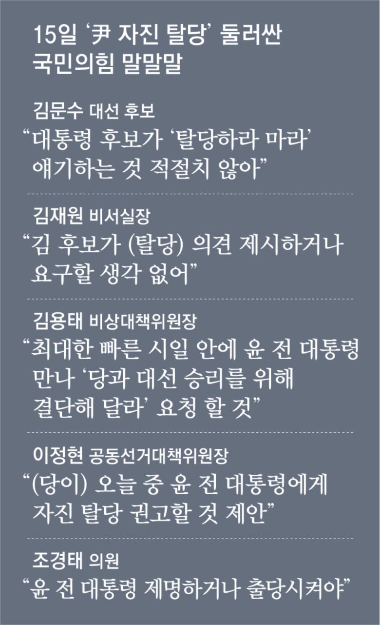 윤 전 대통령이 김 후보의 요청이 있기 전 자진 탈당에 선을 긋고, 김 후보는 당내 탈당 요구를 윤 전 대통령의 결정으로 미루면서 윤 전 대통령 탈당 문제는 도돌이표를 그리는 형국이다. 한 재선 의원은 “후보가 이 정도로 얘기하는 건 윤 전 대통령의 자진 탈당을 바라는 것”이라며 “윤 전 대통령이 강성 지지층의 정서를 건드릴 결정을 당에 떠넘기고 있다”고 비판했다.