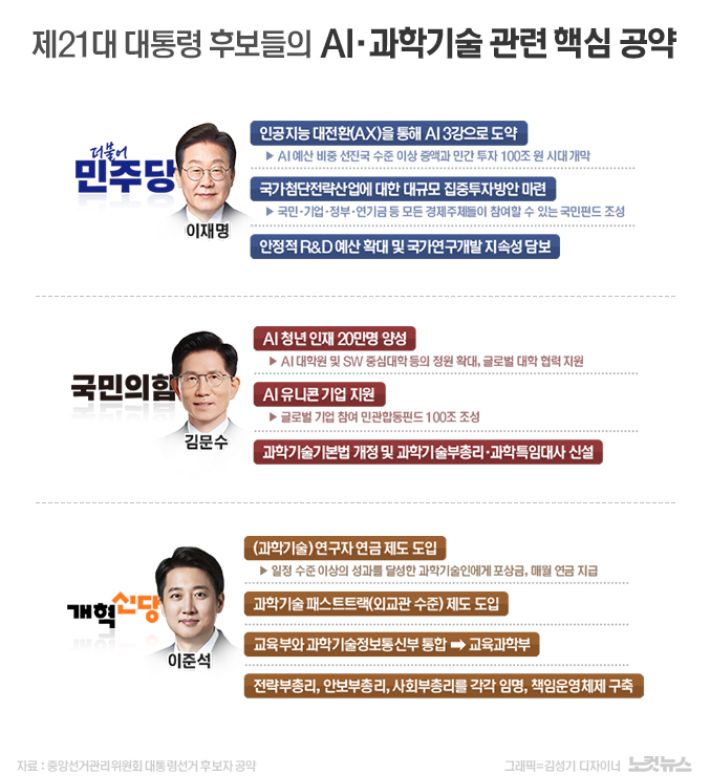 세부적으로 더불어민주당 이재명 대선후보는 단기적인 AI 먹거리 마련에 방점을 찍었고, 국민의힘 김문수 대선후보는 장기적인 성장을 위한 기반을 다지는 데 집중할 것으로 보인다.